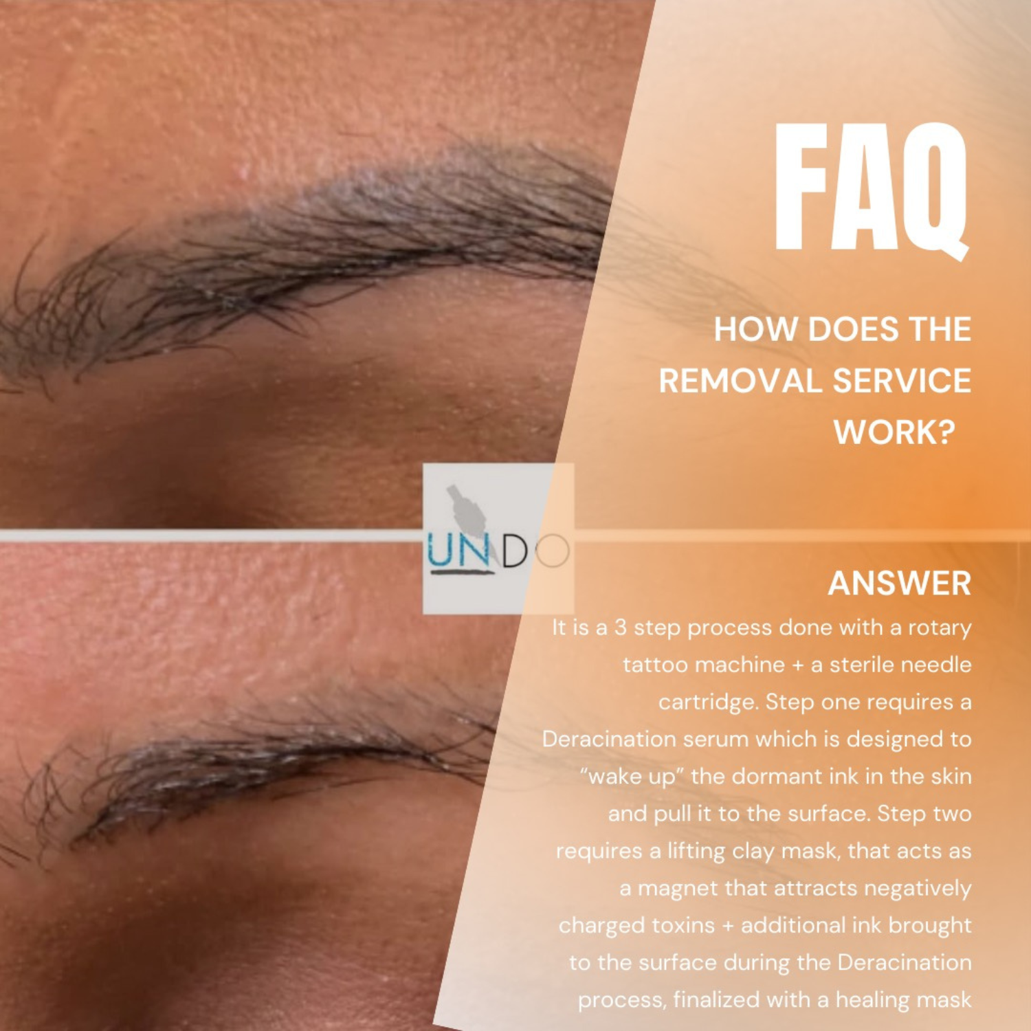 Say goodbye to unwanted brows, eyeliner, or lip pigment with our UNDO Non-Laser Tattoo Removal. This natural 3-step system safely and effectively removes permanent makeup from all skin tones (without lasers, acids, or harsh chemicals). We utilize nourishing healing masks/gels to help aid in quicker healing!