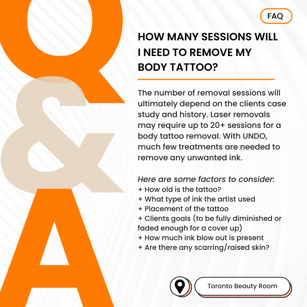 There are a number of factors that will dictate this, the depth of the ink, the type of ink used and the age of the tattoo and if there were any cover/touch ups. Smaller tattoos may require only two to three treatments. UNDO will lighten or remove any color, unlike LASER, which can only remove certain colors successfully.